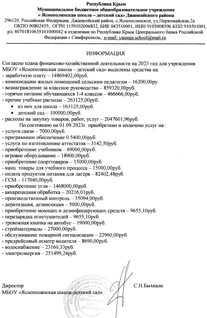 В плане финансово-хозяйственной деятельности МБОУ "Яснополянская школа-детский сад" отражаются все показатели по поступлениям и выплатам учреждения, производимых из средств местного бюджета